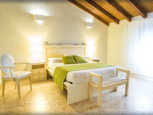 Habitación muy confortable con unos 30m2, techos altos abuhardillados de madera y decorada con tonos cálidos para favorecer el descanso.